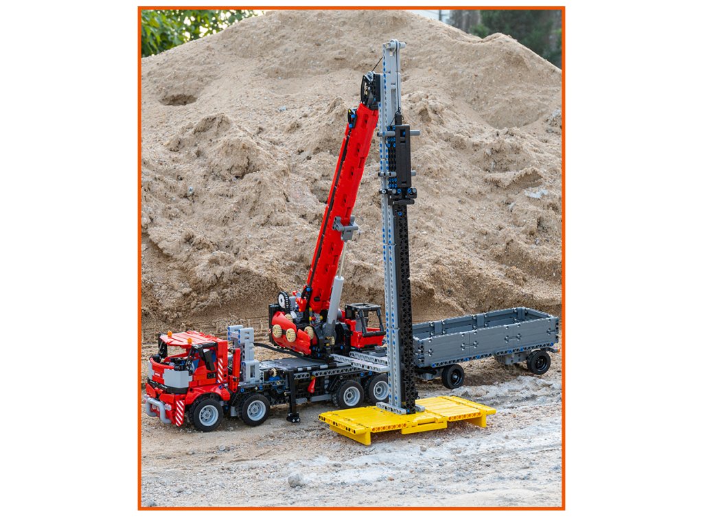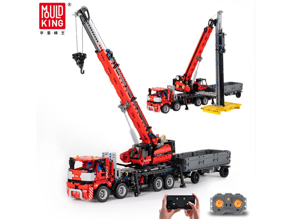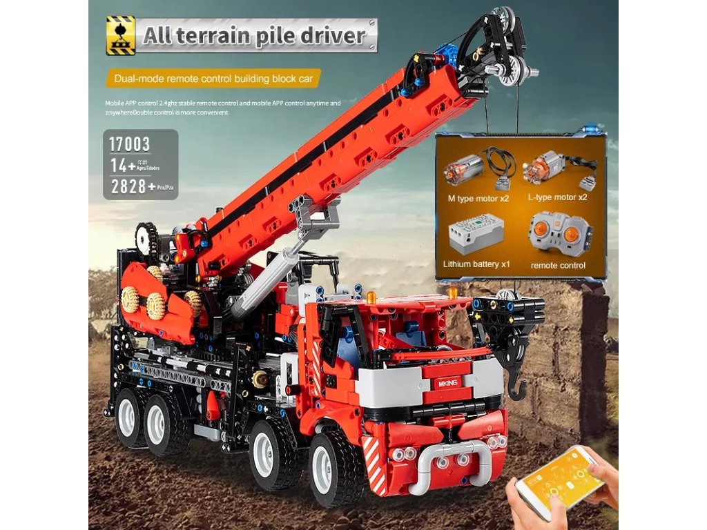 Stavebnice Mobilní R/C jeřáb Mould King 17003 – Models nabízí realistický model mohutného stavebního stroje, který lze sestavit ve dvou variantách – mobilní jeřáb (Crane mode) nebo pilotážní zařízení (Piling mode). Model obsahuje úctyhodných 2828 dílků, řadu elektrických komponentů a plně funkční dálkové ovládání.