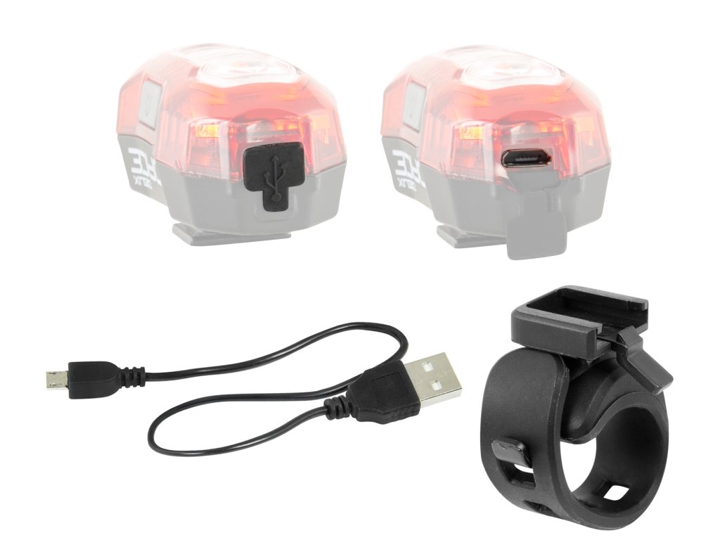 Výkonná USB dobíjecí zadní blikačka „Deux“ se třemi vysoce svítivými LED a jednouvýkonnou LED 0,5W. Disponuje pěti funkcemi svícení a blikání a je velmi dobře