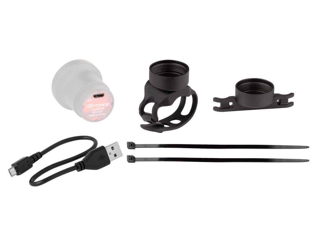 Součástí balení je držák na sedlovku, na sedlo a dobíjecí USB kabel.