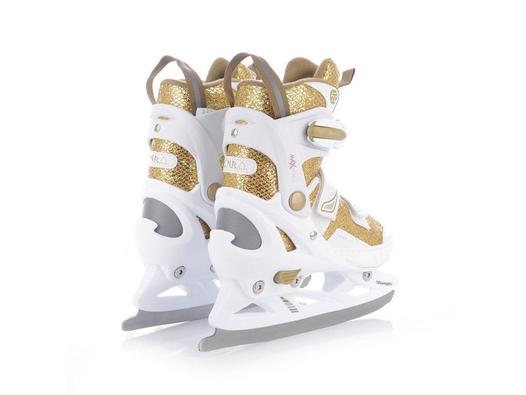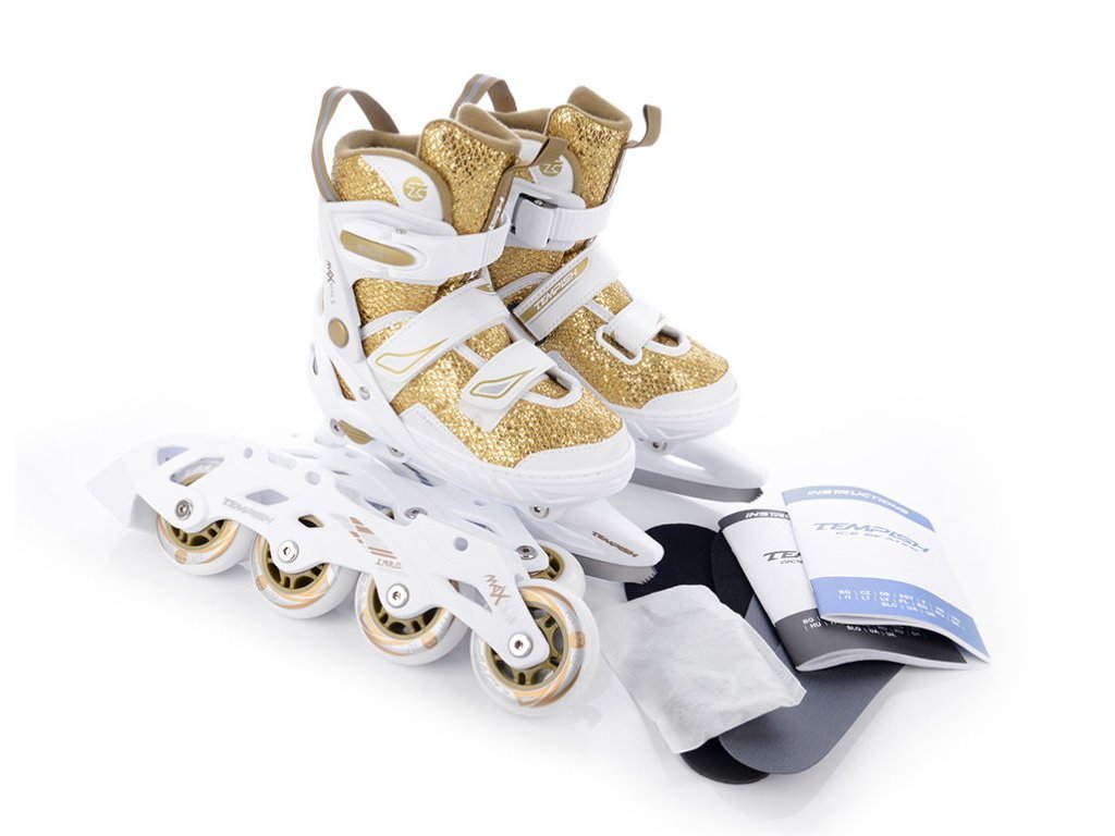 Dětské roztahovací brusle ENBO RL DUO GOLD se speciální duální konstrukcí pro celoroční rekreační bruslení. Konstrukční systém umožňuje záměnu zimních bruslí za podvozek s kolečky. Jednoduchým povolením tří šroubů přeměníte zimní brusle na kolečkové inline brusle a naopak.