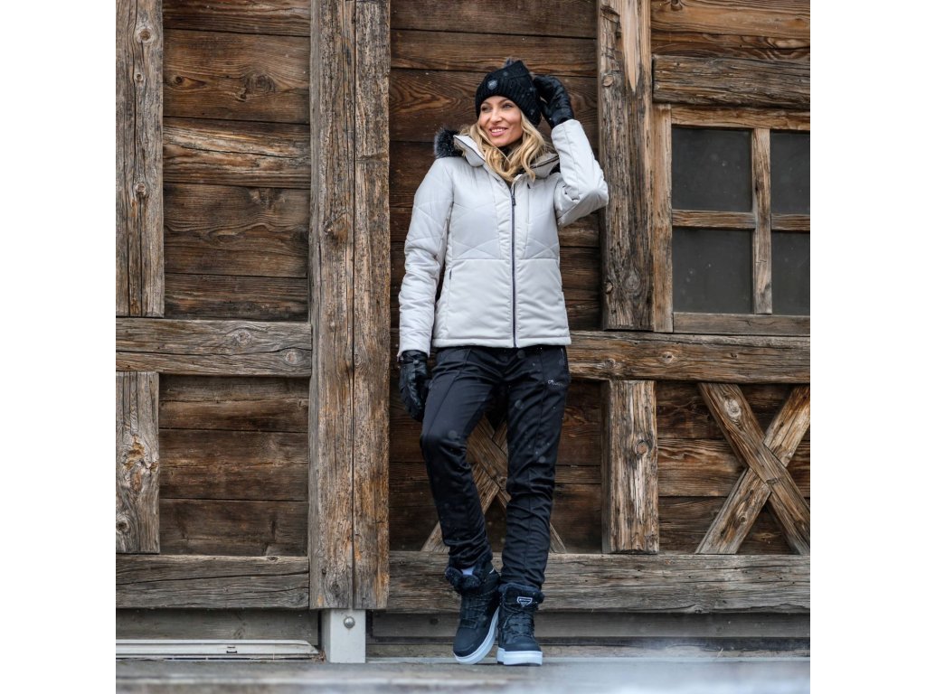 Dámská zimní lyžařská bunda s membránou NADDRA vyniká moderním a elegantním prošívaným designem, který zaujme na svahu i ve městě. Je ideální na lyže i jiné zimní aktivity v horách nebo ve městě. Vyrobena je z nepromokavého, prodyšného, větruodolného a pružného materiálu s celopotištěným povrchem a membránou PTX SNOW, která zajišťuje vodní sloupec 10 000 mm, paropropustnost 10 000 g/m2/24h a hodnotu Ret < 10. Povrchová úprava DWR zvyšuje odolnost vůči vodě a nečistotám. Střední hřejivá výplň, efektní podšívka a přiléhavý střih poskytují komfort i ženský vzhled. Švy jsou podlepené, prošívání dekorativní. Kapuce je odepínatelná se stahováním, kožešina i vnitřní hřejivý límec lze rovněž odepnout. Rukávy mají vnitřní elastickou manžetu s otvorem na palec, odvětrávání v podpaží se zipy umožňuje regulaci teploty. Odepínatelný sněhový pás s elastickou vsadkou zajišťuje volnost pohybu, spodní lem lze stáhnout gumičkou. Bunda má šest praktických kapes, klíčenku v kapse a stylovou nášivku na rukávu. Dámská lyžařská bunda NADDRA je skvělou volbou pro ženy, které hledají kombinaci funkčnosti, tepla a elegance.