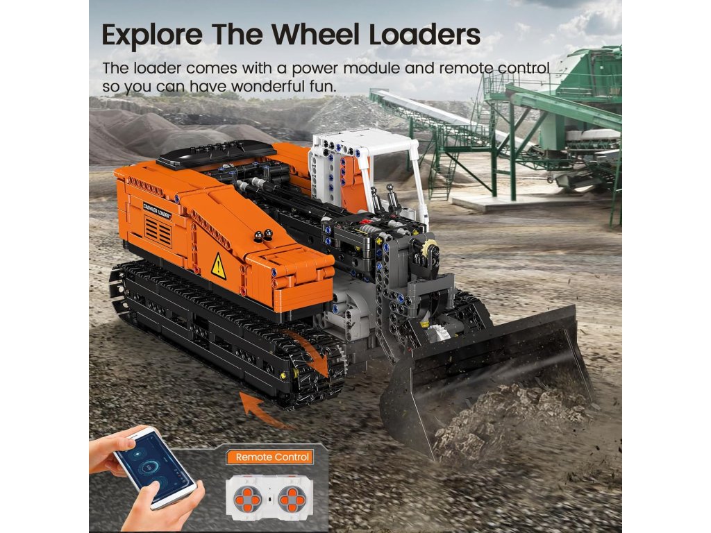 MOULD KING 17054 – pásový nakladač je detailní a funkční model pásového stavebního stroje. Díky dálkovému ovládání i APP ovládání přes mobil můžete rozpohybovat lopatu, jezdit vpřed i vzad a otáčet celý stroj na pásovém podvozku. S více než 1400 dílky (1423 ks) přináší stavebnice realistický vzhled a skvělou hratelnost.