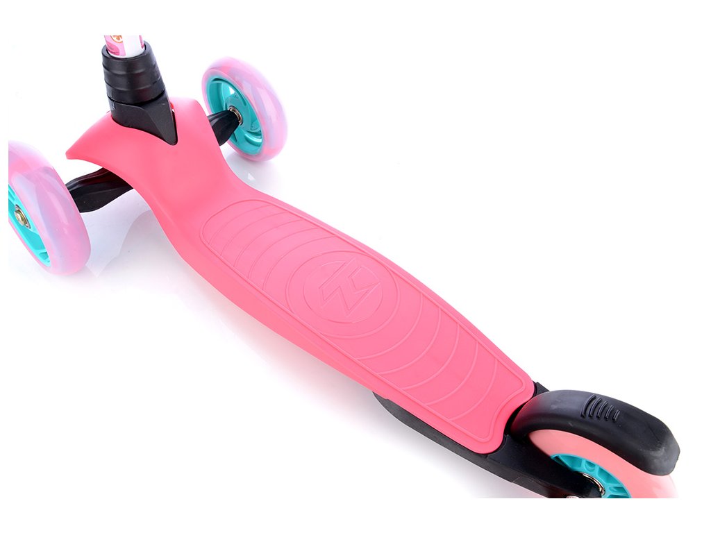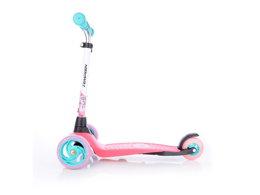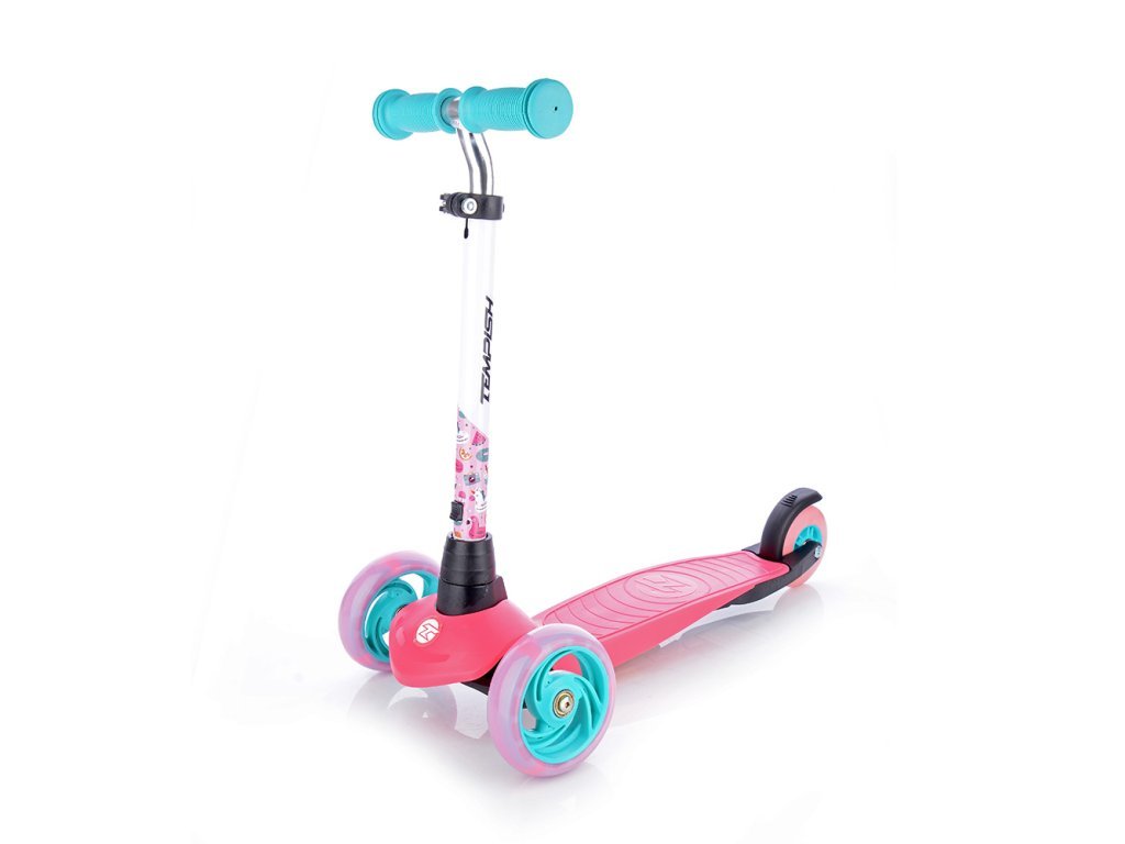 Bezpečná skládací koloběžka se zvýšenou stabilitou pro začínající sportovce. Přední náprava se natáčí klasicky jako u běžných koloběžek, nikoli přenášením váhy jezdce na stranu. Koloběžka má omezení maximálního úhlu vytočení.