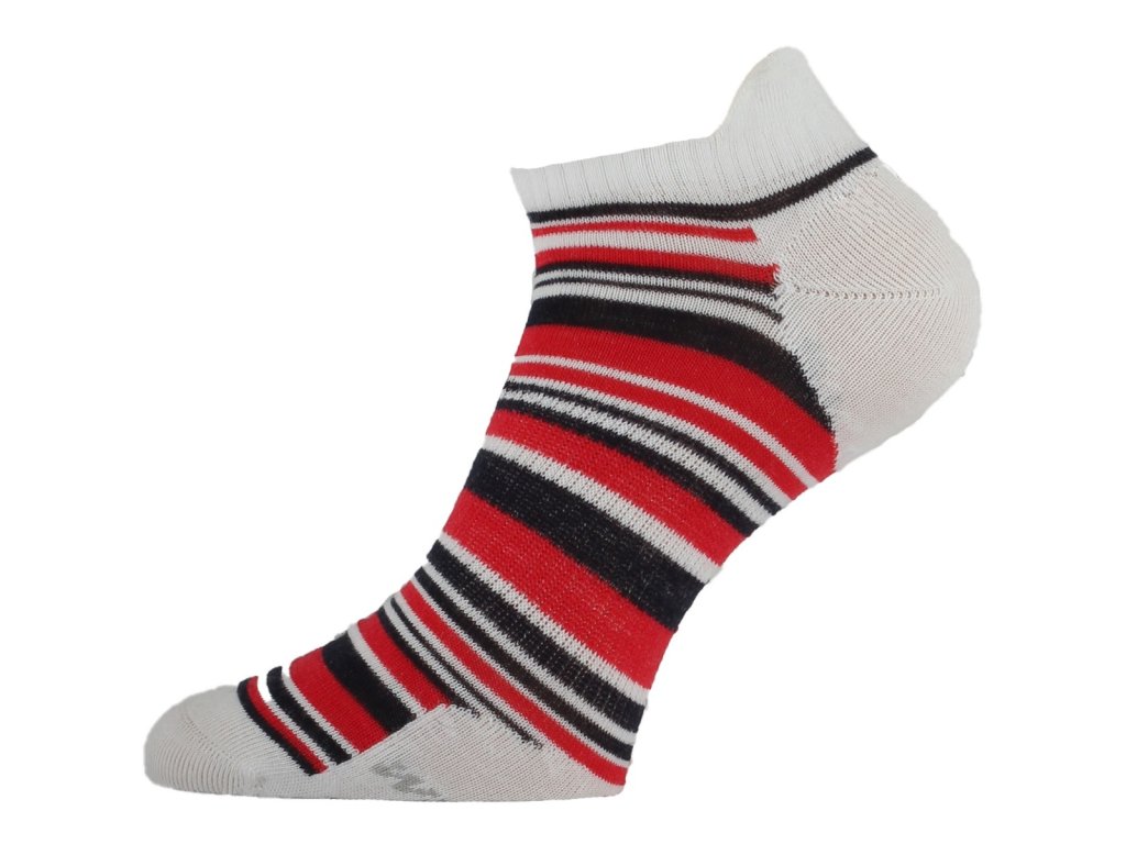 WCS is a striped design, short and thin womens trekking sock made from single knitting. These socks contain merino wool, which is a unique natural material. and COOLMAX fibres - a polyester material. Because of this combination, moisture is quickly removed from the skin, thus increasing physical performance and comfort during sport activities or walking. The toe and heel sections are made of a smooth knit, which provides high mechanical resistance. Wool has excellent antibacterial properties and reduces unpleasant odors. Elastic around the ankle keeps sock firmly in place. The sock is finished with a thin elastic welt with a loop for easy sock tension, as well as elastic bandage in the foot, and a seamless toe. MATERIÁL: 45% COOLMAX,40% MERINO WOOL, 10% POLYMADE, 5% LYCRA