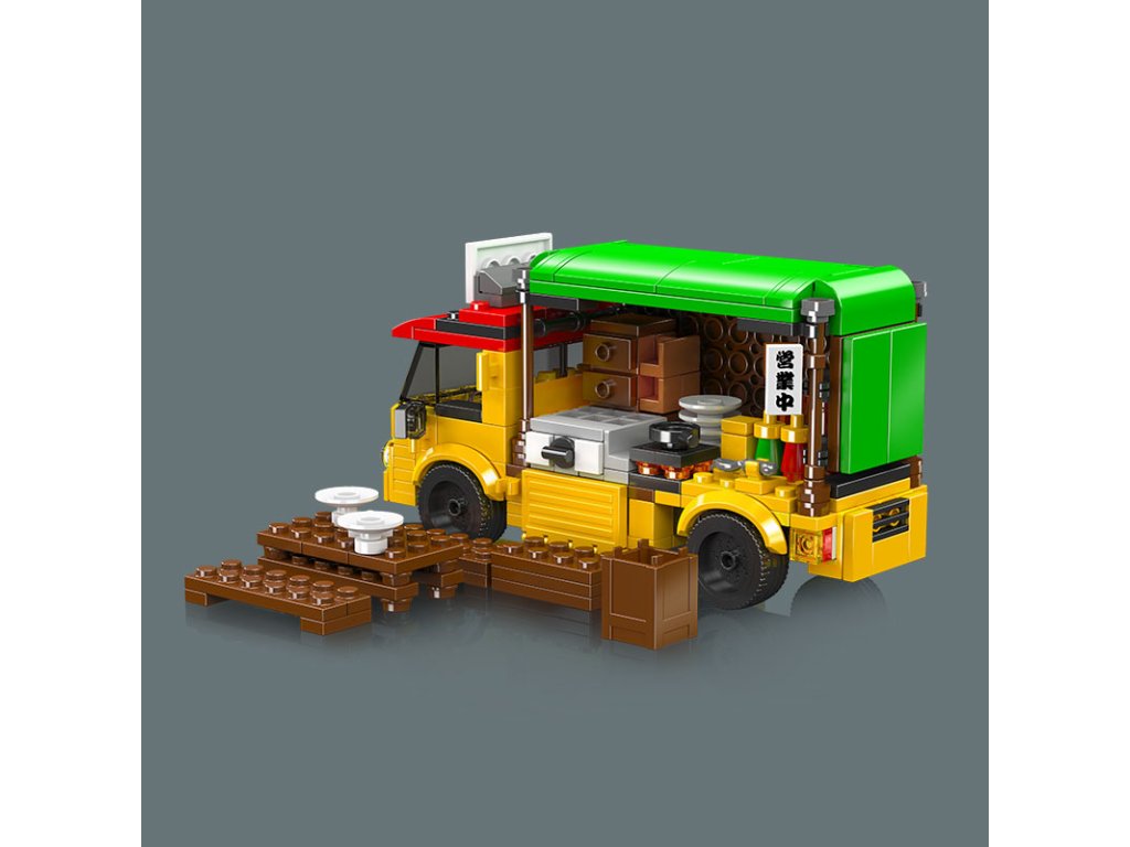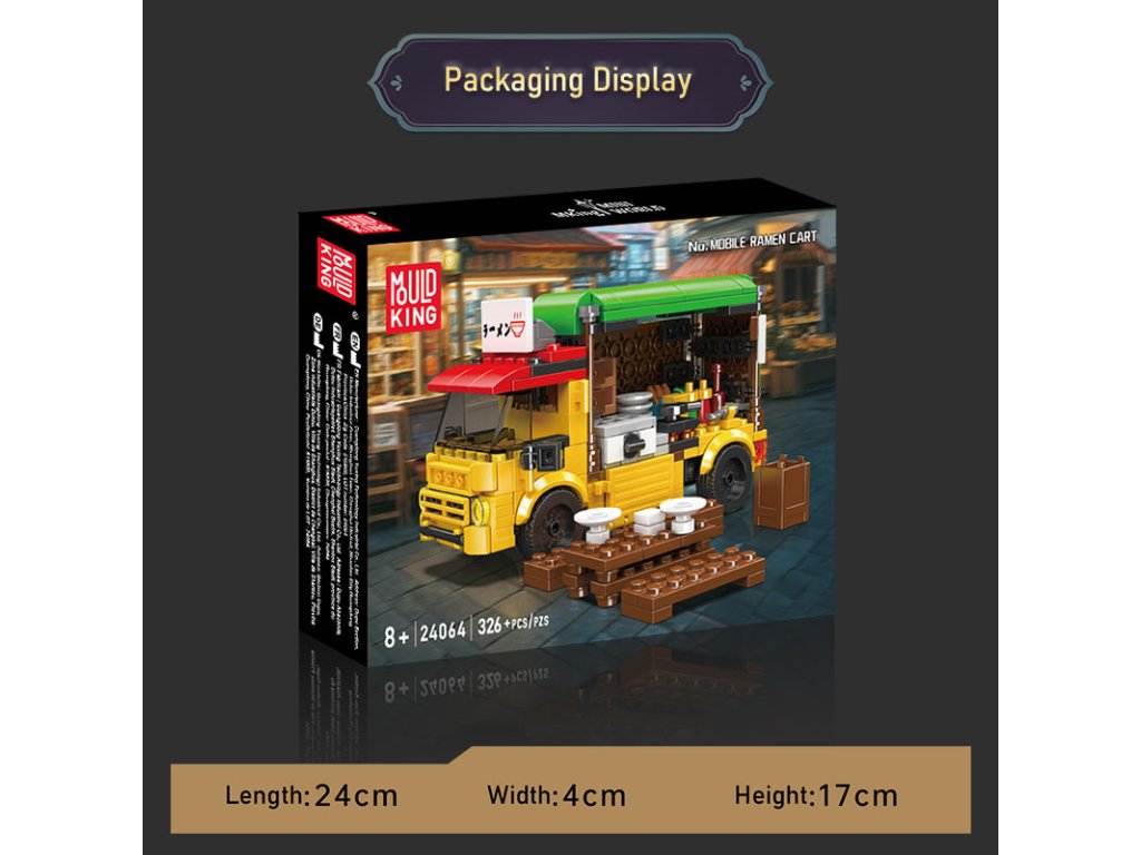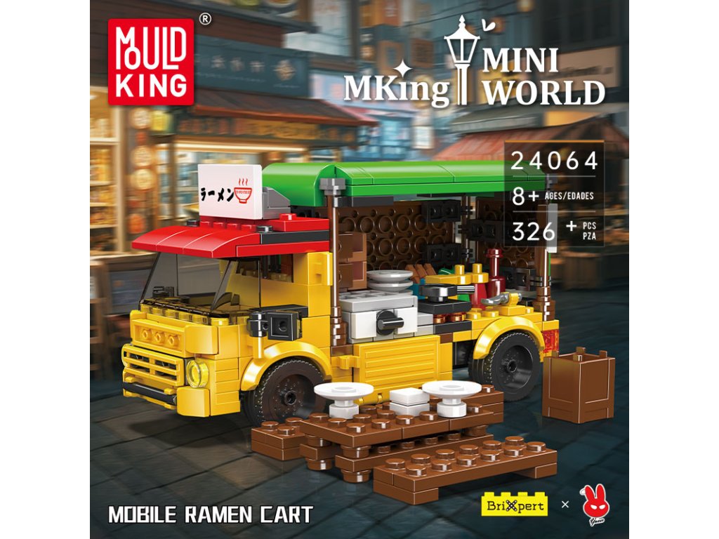 Stavebnice MOULD KING 24064 – Mini Street Series Mobilní food truck přináší barevný a detailní model pojízdného stánku s jídlem. Se 326 dílky postavíte žlutý truck s červenou markýzou a zelenou střechou, vybavený kuchyňským interiérem a venkovním posezením se stoly a židličkami.
