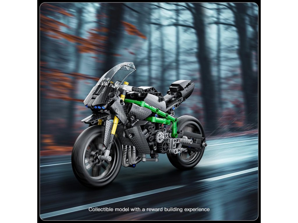 Stavebnice MOULD KING 23002S – HZ-R Motorcycle vnáší do vaší sbírky svěží nádech rychlosti a výkonu. Tento model inspirovaný supersportem H2R kombinuje černé karbonové díly, zelený rám a zlatou přední vidlici, čímž mu dodává autentický a agresivní vzhled.