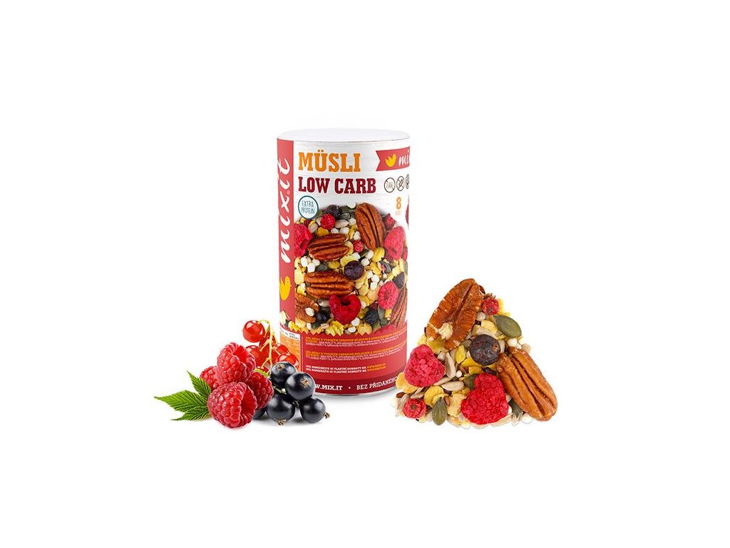 První low carb müsli od Mixit. Obsahuje jen 10 % sacharidů! Hledali jste mix müsli s minimem sacharidů a cukrů a zároveň s vydatnou porcí bílkovin a vlákniny? Je tady první "low carb" müsli, které nabídne chuťový koncert mrazem sušeného ovoce s křupinkami bohatými na proteiny, pekanových oříšků a 3 druhů semínek. Mix obsahuje pouze 10 % sacharidů a z toho jen 5,1 % cukrů z černého a červeného rybízu s malinami. 28 % bílkovin v kombinaci rostlinné a syrovátkové složky uspokojí nejen náročné sportovce. Nabijte se low carb energií od Mixit.