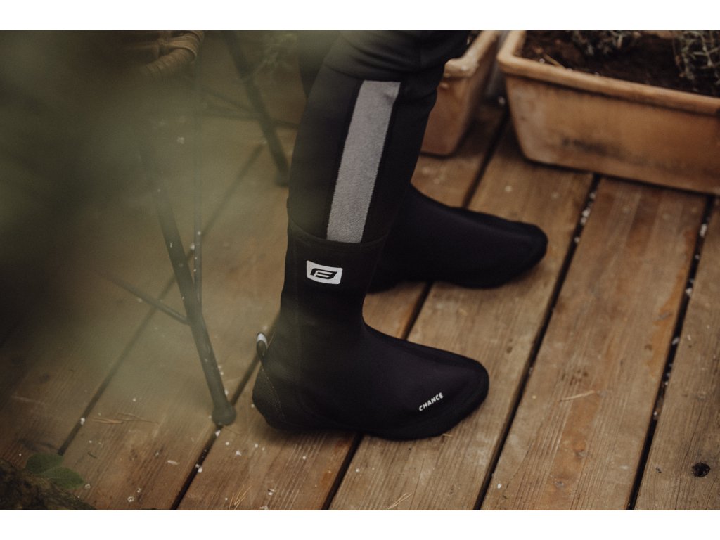 oblékání: nejprve návlek natáhneme na lýtko, poté obujeme tretru, návlek přetáhneme přes tretru a zapneme na podrážce