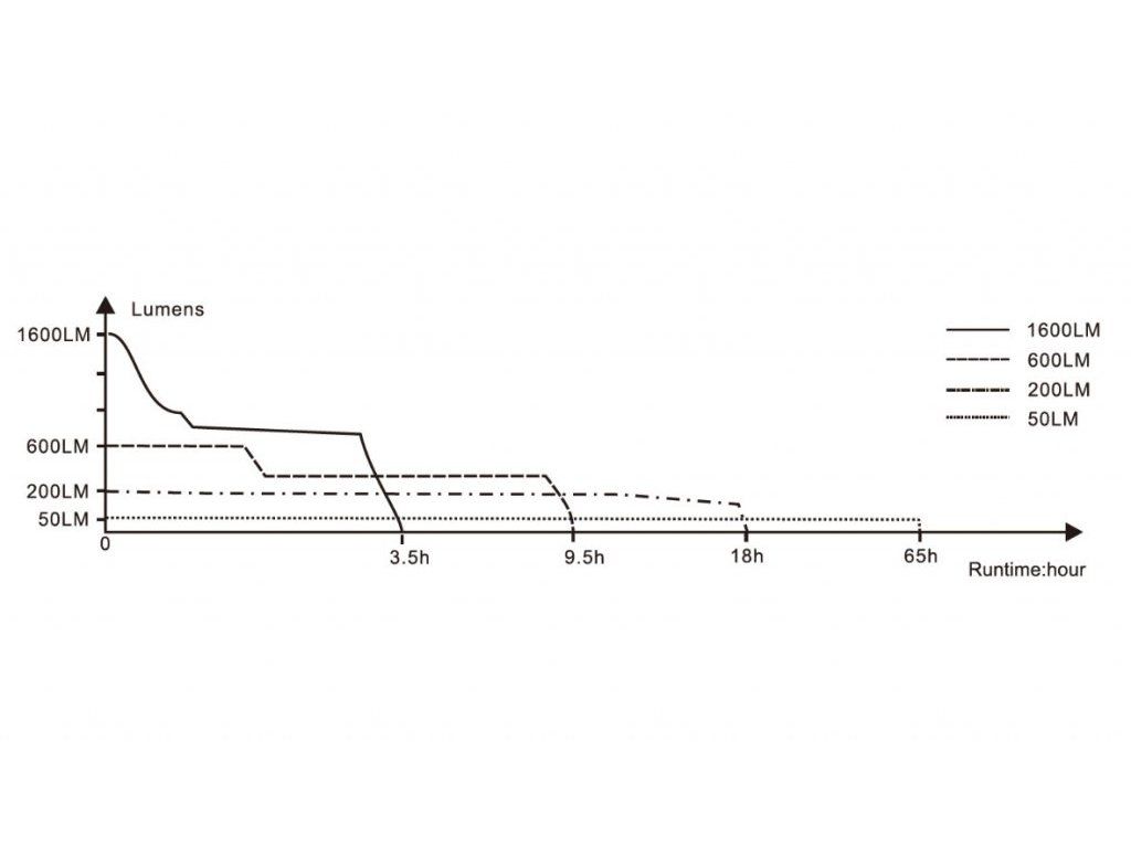 - Celkem pět režimů výkonu: 1600 lumenů (3,5 hodiny*) -> 600 lumenů (9,5 hodiny) -> 200 lumenů (18 hodin) -> 50 lumenů (65 hodin) -> blikání (pulzování mezi 50 a 600 lumeny).