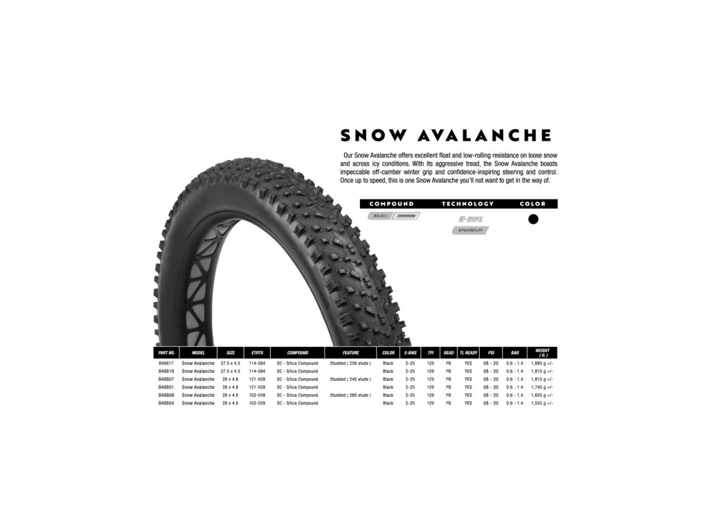 Snow Avalanche vyniká agresivním vzorkem, který zajišťuje vynikající záběr na sypkém sněhu, a zároveň nabízí nízký valivý odpor. Díky speciální silikové směsi (SC - Silica Compound) si plášť udržuje pružnost i v mrazu, což je klíčové pro přilnavost na ledu a zmrzlém povrchu.