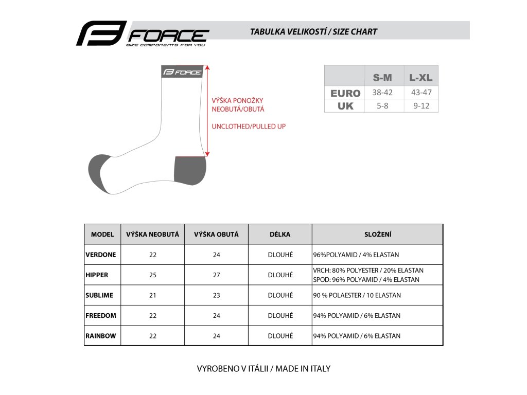 Prémiové vyšší cyklistické ponožky FORCE jsou vyrobené v Itálii a garantují špičkové zpracování a nejmodernější technologie. Díky extra kompresnímu materiálu a precizně vypletenému designu poskytují optimální podporu a pohodlí i při náročné jízdě. Byly testovány a vyvíjeny ve spolupráci s profesionálními závodníky, což zaručuje jejich vysokou výkonnost a spolehlivost.