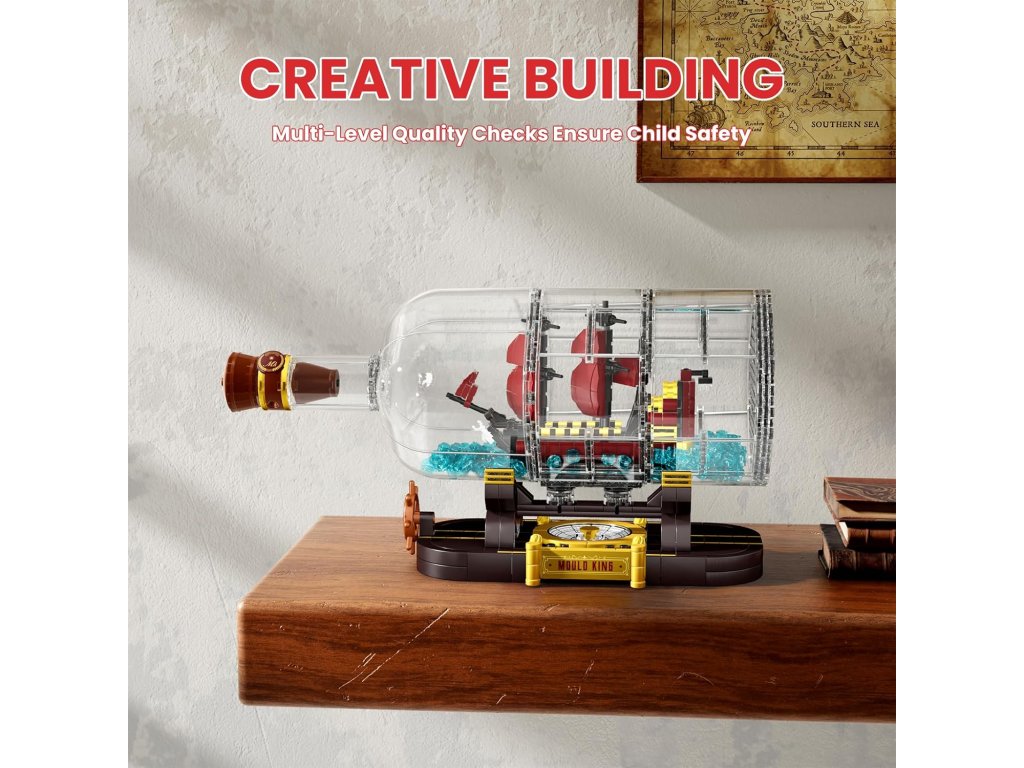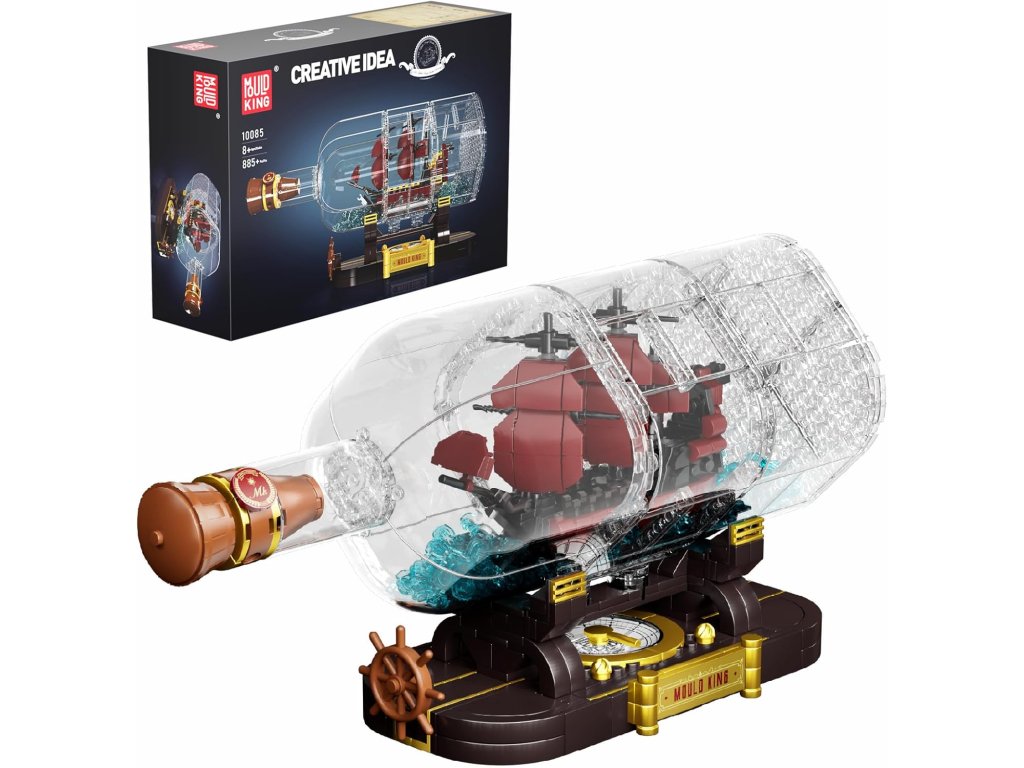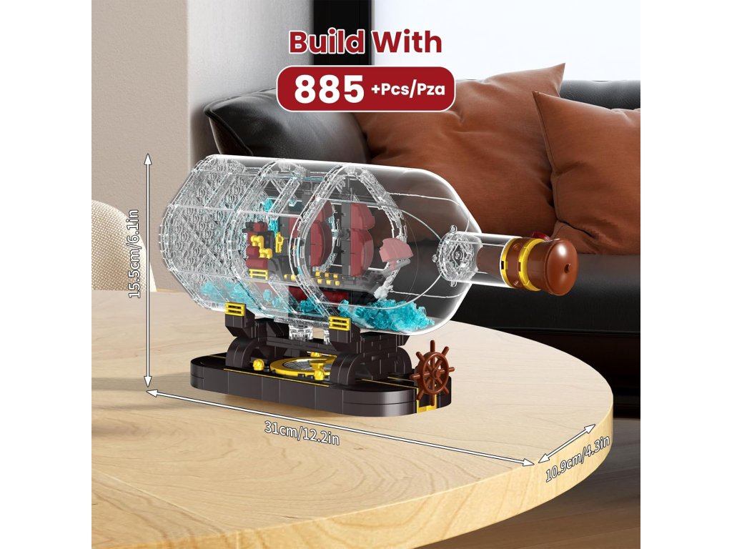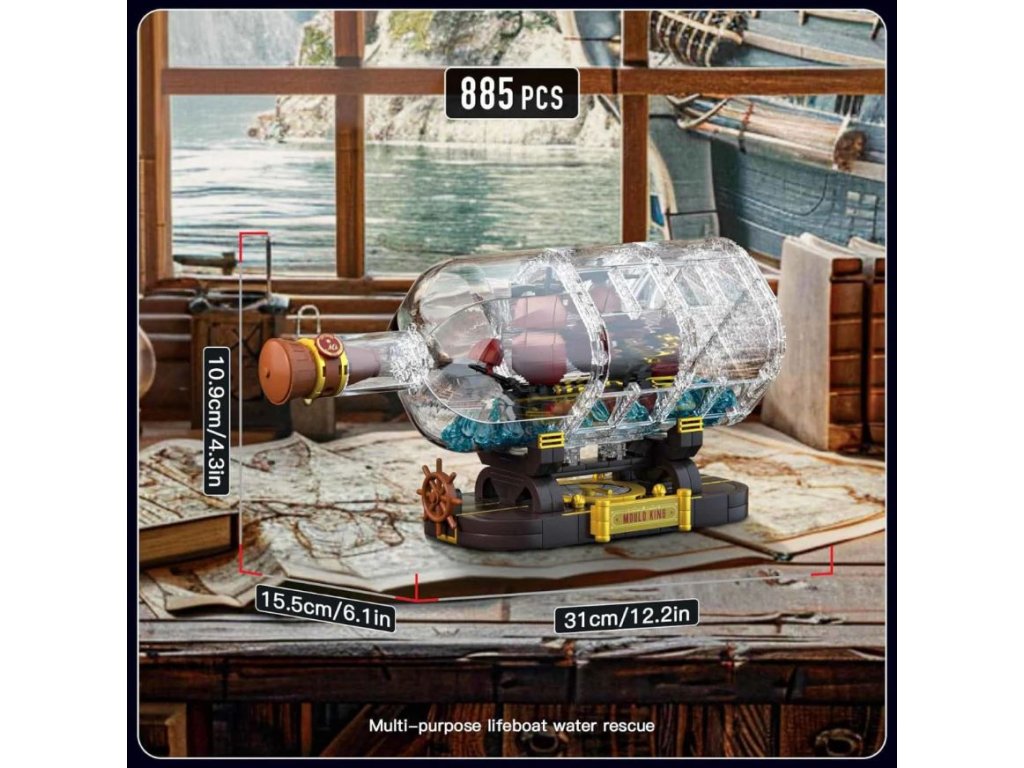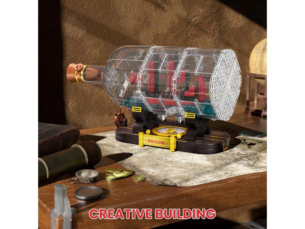 Stavba je jednoduchá a zároveň poutavá – díky obrázkovému návodu si ji užijí i stavitelé od 8 let. Transparentní dílky láhve vytvářejí unikátní efekt „lodě v láhvi“, který ocení jak děti, tak dospělí milovníci modelů.