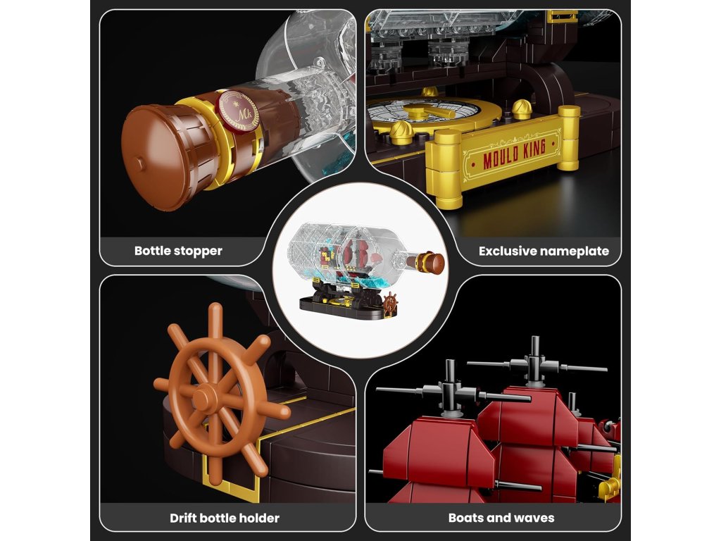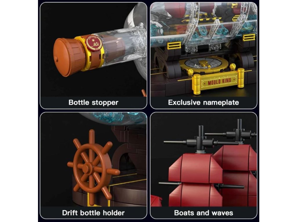 Stavebnice MOULD KING 10085 – Mini pirátská loď Královna mstitelka v láhvi je kompaktní a efektní model ukrytý v elegantní průhledné láhvi. Přes 885 dílků z kvalitního ABS plastu vytváří dechberoucí dekoraci, která spojuje kreativní stavitelství s nádechem dobrodružství.