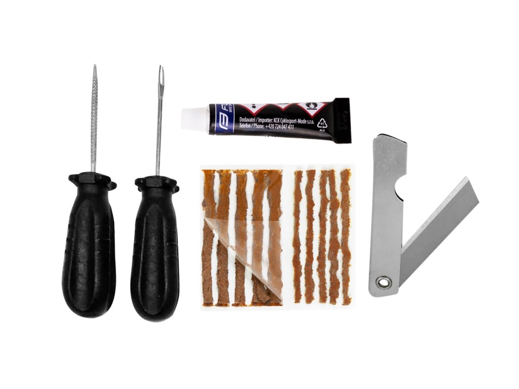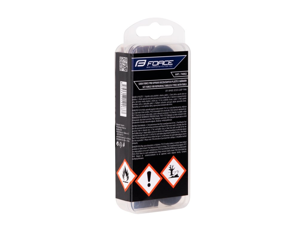 sada FORCE pro opravu defektu u bezdušových (tubeless) plášťů s nářadím obashuje:1 x jehlu čistící-černá rukojeť (průměr 4mm x délka 100 mm)