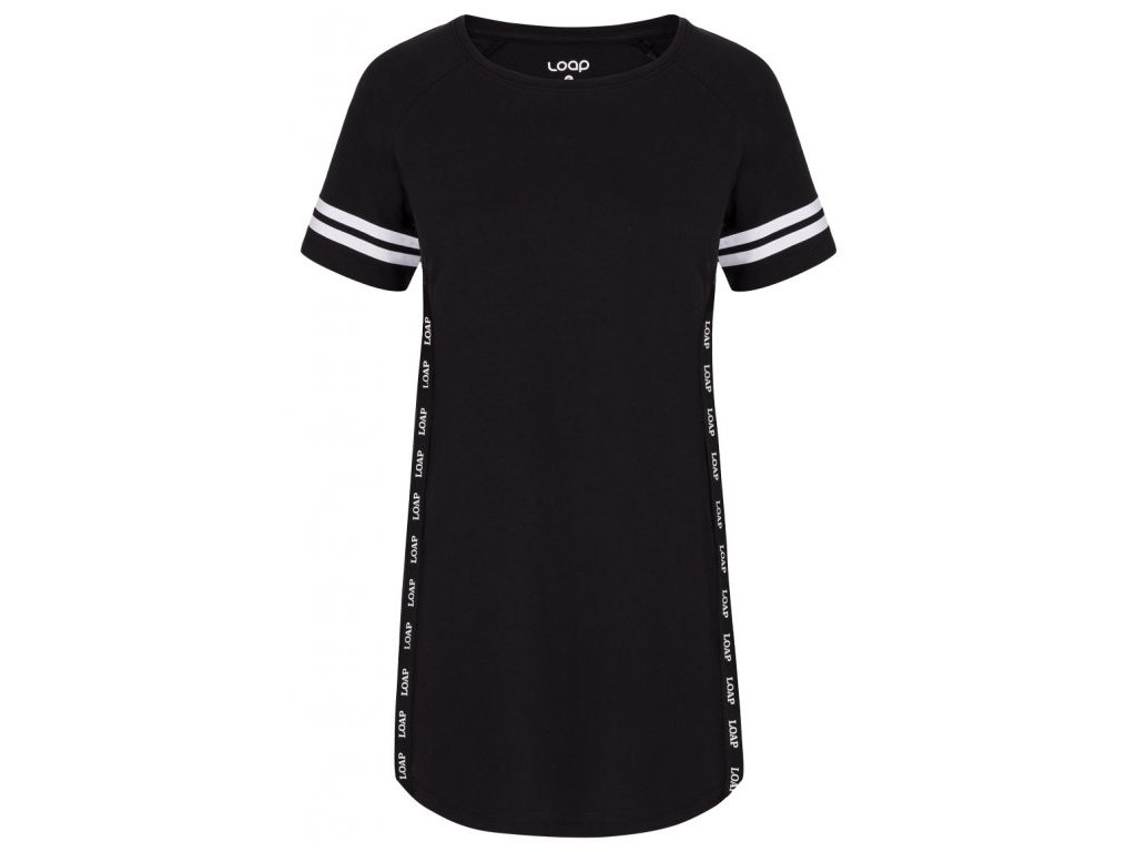 Šaty jsou ušity ze 100% bavlny, jsou tak velice příjemné na omak a s nižší gramáží dostatečně prodyšné i během teplejších letních dnů. Mají volný střih s kulatým výstřihem, raglánovými rukávy a pasem bez stahování, délkou se řadí ke středně dlouhým. Aby vám šaty posloužily ještě lépe, ať už je obléknete na dovolenou nebo na doma, jsou vybaveny dvěma praktickými kapsami. Jinak jednoduchý styl je ozvláštněn kontrastními proužky na rukávu a nášivkami s textem Loap na bocích po celé délce šatů.