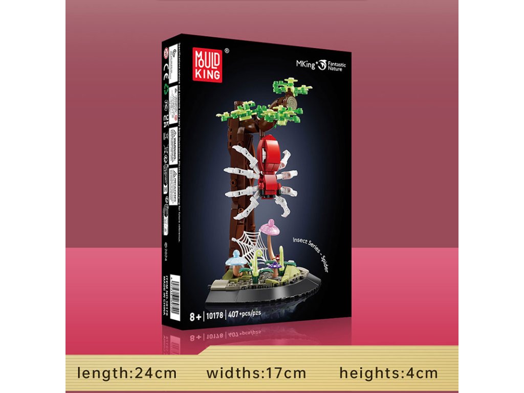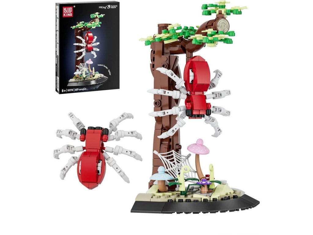 Stavebnice MOULD KING 10178 Pavouk na pavučině obsahuje 407 dílků a představuje děsivě krásnou scénu pavouka zavěšeného ve své spletité síti na větvi. Díky rozměrům 20 × 13,3 × 12,5 cm je ideální dekorací do sbírky Fantastická příroda – Hmyz.