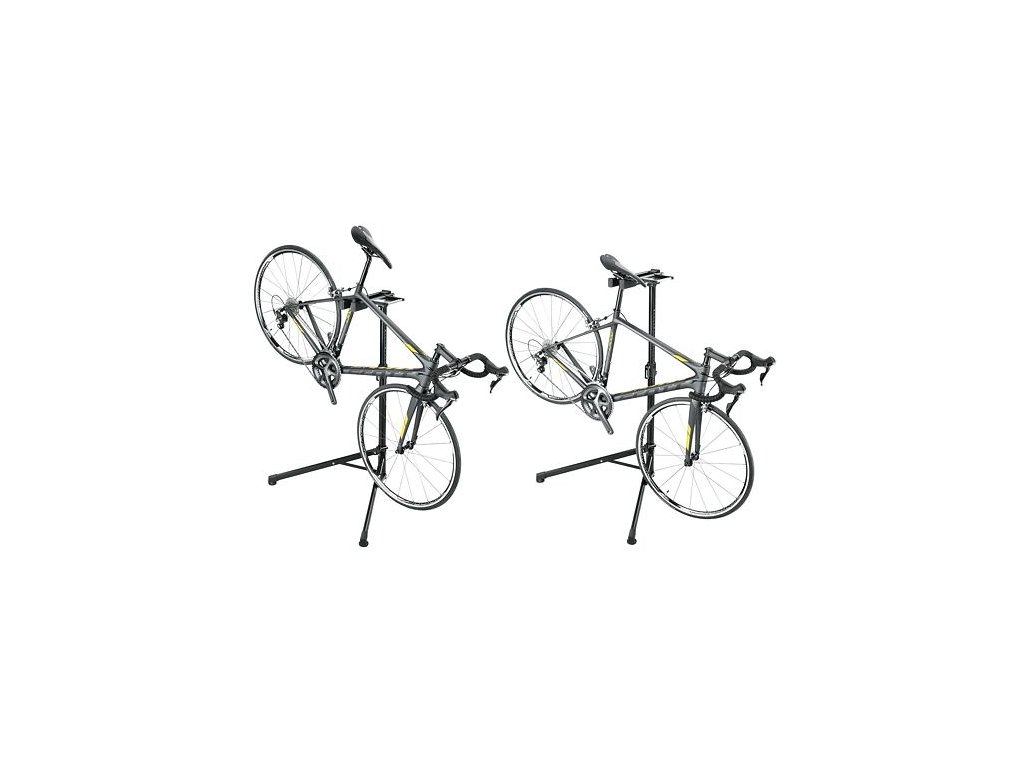 Tento jednoduchý a snadno použitelný montážní stojan nevyžaduje žádnou montáž nebo upínání, které by mohlo poškrábat nebo poškodit povrch sedlové trubky nebo sedlovky vašeho kola. Stačí zvednout kolo, zavěsit sedlovku nebo sedlovou trubku na rameno držáku na kolo a zvednout zadní kolo pro údržbu a seřízení kola. Volitelná přihrádka na nástroje drží nástroje a malé díly blízko pro snadný přístup.