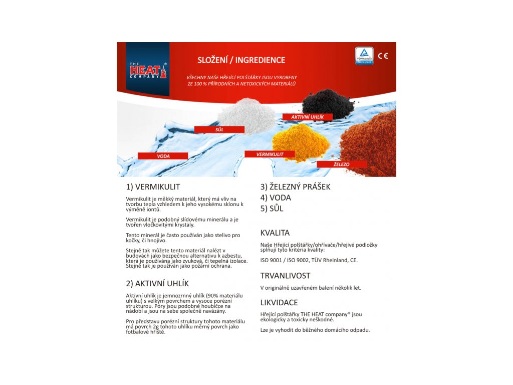 Železný prášek v hřejícím polštářku v kombinaci s kyslíkem obsaženém ve vzduchu vytváří reakci generující teplo. Sůl s vodou působí jako katalyzátor* reakce uhlíku s vermikulitem, která působí jako rezerva vody.
