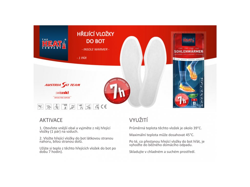 Hřejivé vložky do bot začnou hřát v následujících minutách. Průměrná teplota těchto hřejících vložek do bot je okolo 39°C. Maximální teplota může dosahovat 45°C. Teplo z těchto hřejívých vložek do bot je možné čerpat po dobu 7-mi hodin.