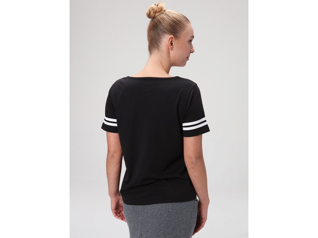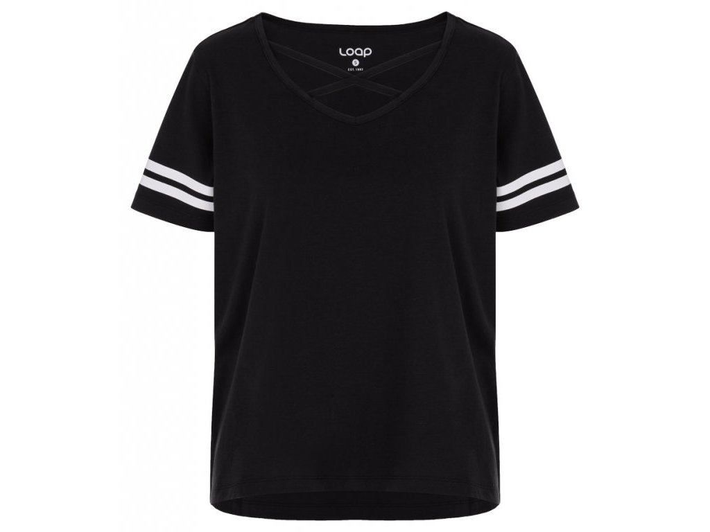 Materiál ze 100% bavlny zaručuje příjemné nošení po celý den i během celého roku. Tričko má volnější střih s prodlouženým zadním dílem a véčkovým výstřihem, který je doplněn stylovým křížením. Elegantní nádech trička podtrhují kontrastní proužky na konci rukávů.