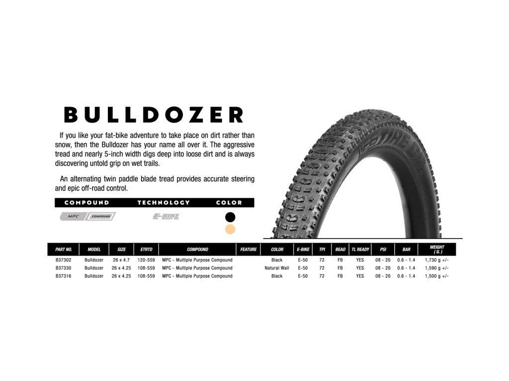 Plášť VEE TIRE CO. Bulldozer 26 x 4,7 je univerzální fatbike pneumatika pro jezdce, kteří chtějí jistotu a zábavu po celý rok – od hlubokého sněhu přes bahno až po suché lesní traily. Široký profil 4,7" a agresivní vzorek dodají kolu obrovskou porci trakce, ale díky promyšlenému uspořádání špuntů si plášť přitom zachovává rozumný valivý odpor.