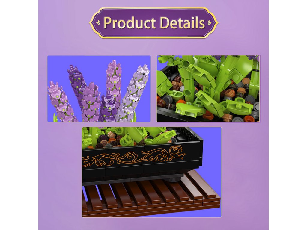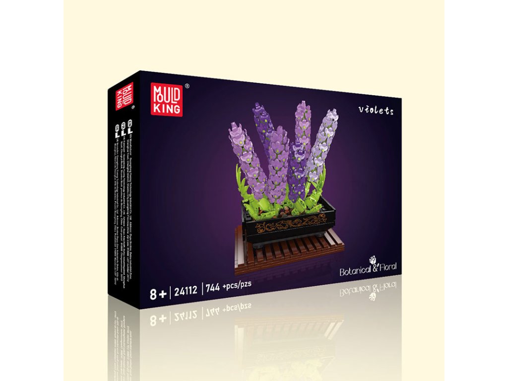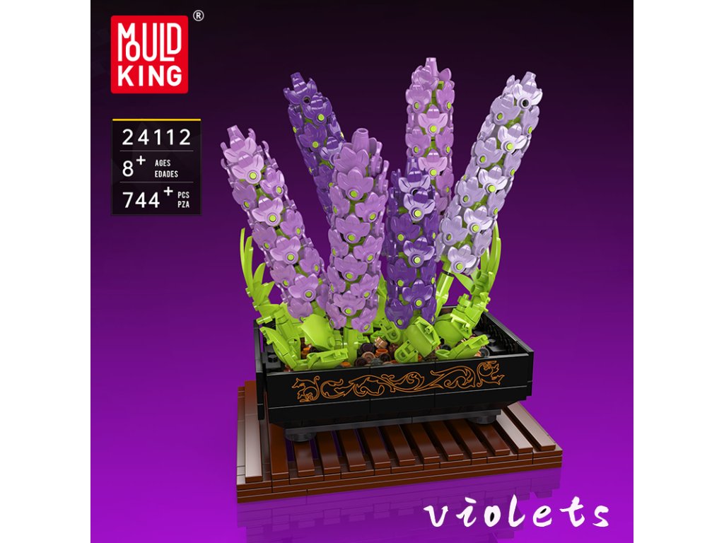 Stavebnice MOULD KING 24112 – Violet Bonsai přináší do vašeho interiéru jemnost a kouzlo přírody v podobě rozkvetlých fialek. Model složený ze 744 dílků působí živě a přirozeně díky kombinaci tmavě a světle fialových květů, elegantně zasazených do černého květináče ozdobeného zlatými motivy, který stojí na dřevěně laděném podstavci.