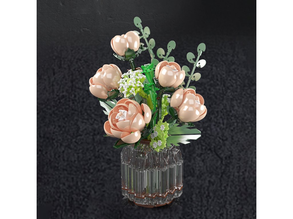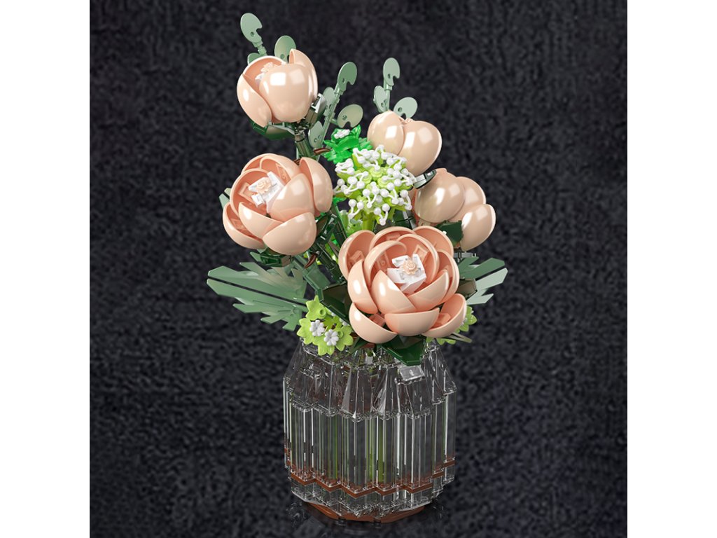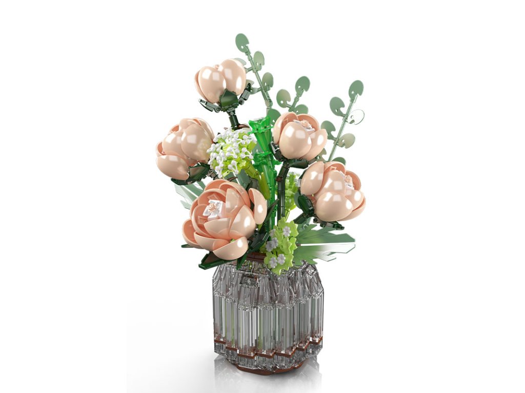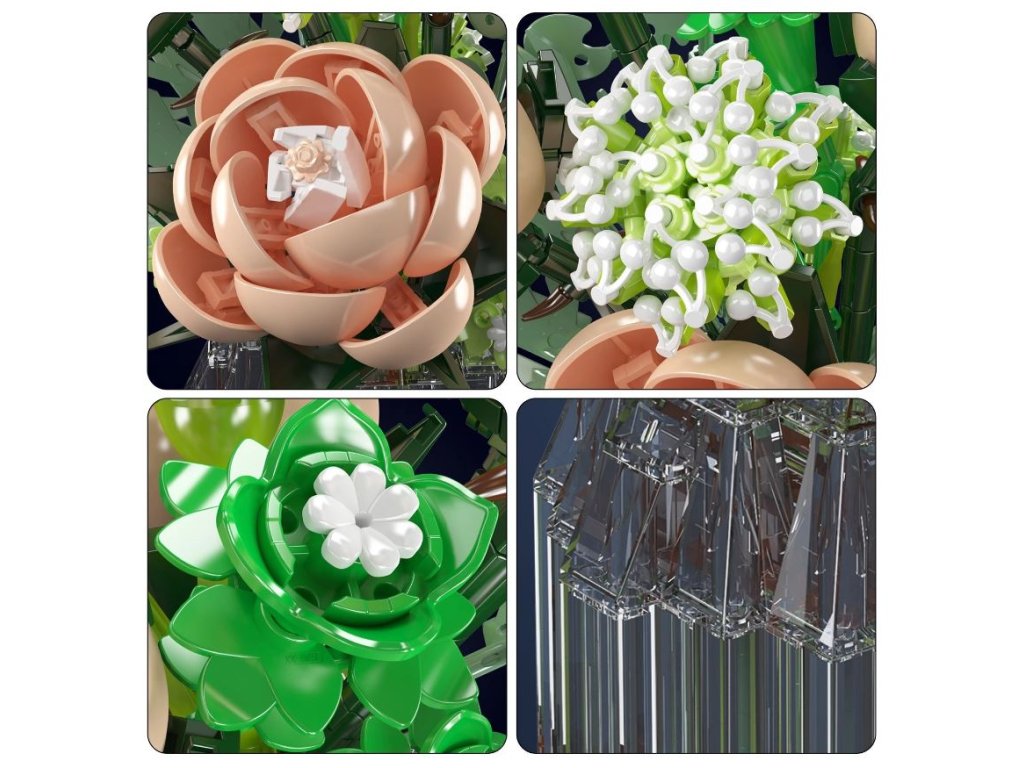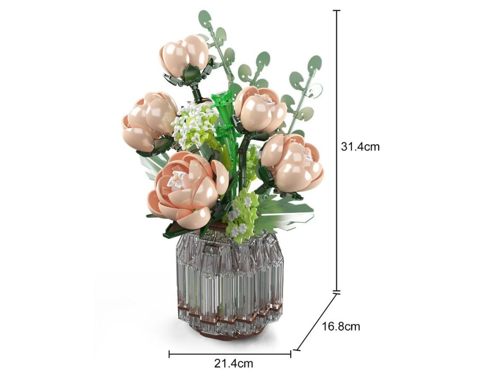 Při stavbě začnete propracovanou vázou s průhlednými dílky a poté přidáte jednotlivé květy a zelené listy. Každý květ můžete polohovat a ladit kompozici podle svého vkusu. Výsledek působí luxusně a v interiéru se stane stylovou dekorací, která neuvadne.