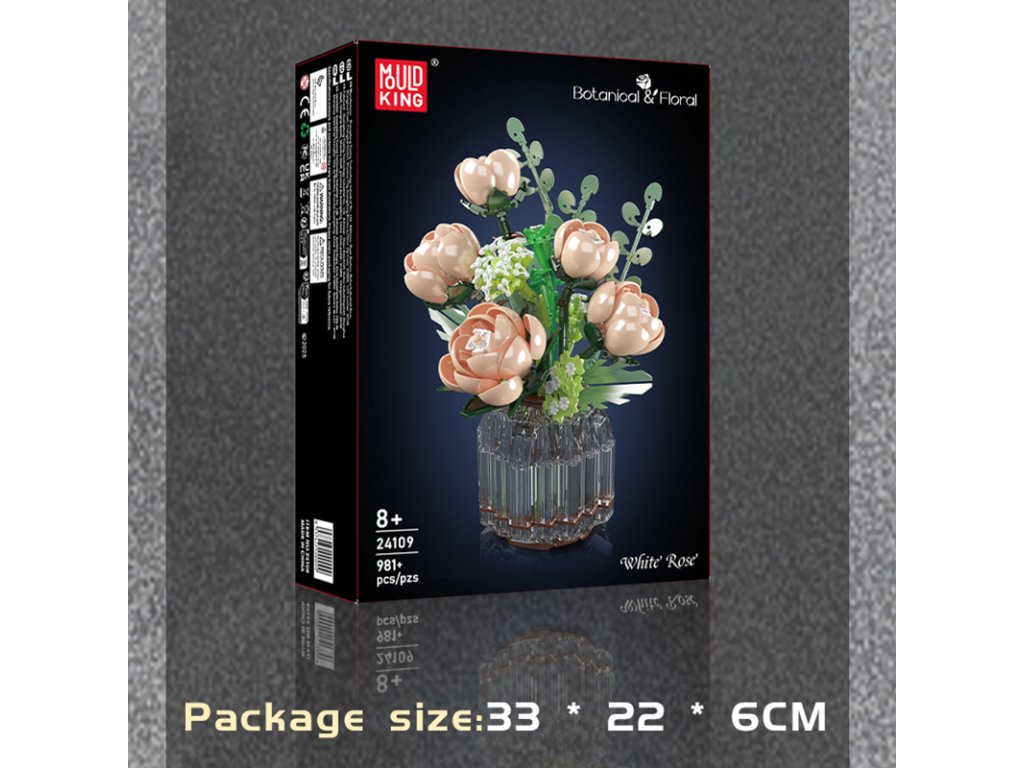 Stavebnice MOULD KING 24109 – White Rose Flower Bouquet je okouzlující botanický set, který vdechne vašemu interiéru nádech jemnosti a romantiky. Z více než 981 dílků si sestavíte realistickou kytici bílých růží s listy a květy, aranžovanou do elegantní čiré vázy.
